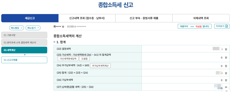 6. 이 정보를 기반으로 납부할 세액이 자동 계산 됩니다.(수입-50% 경비-기본공제 200만원)