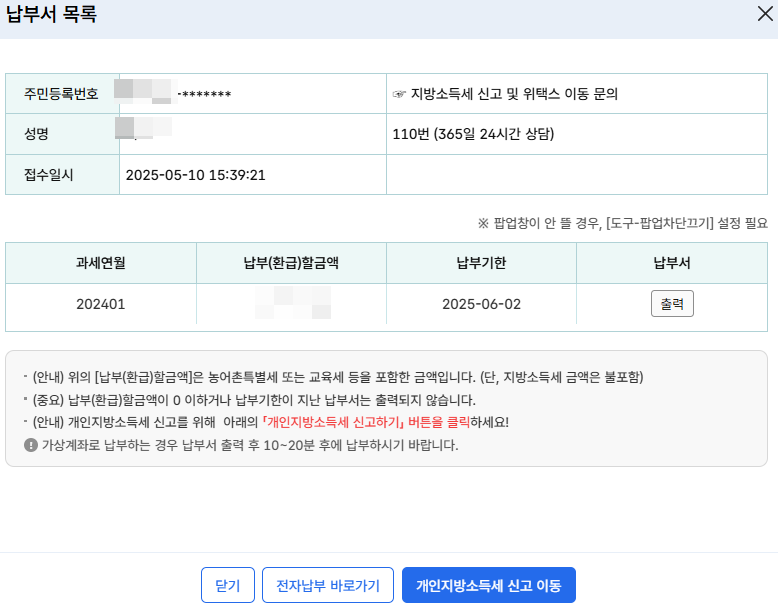 9. 개인지방소득세 신고를 클릭합니다.
