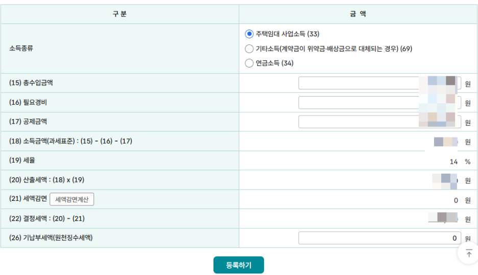 - 수입금액, 필요경비, 공제금액 등을 입력합니다.